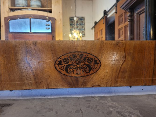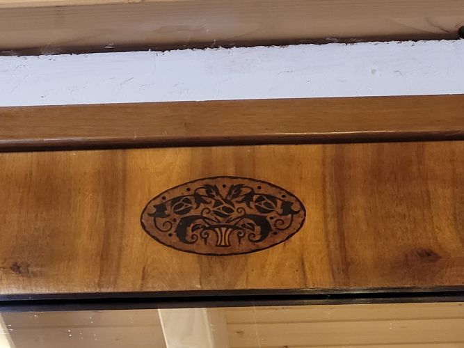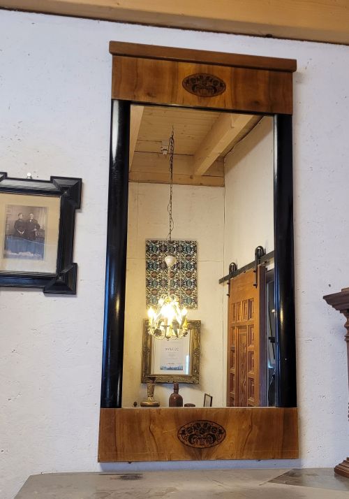 sehr schöner Spiegel in Nußbaum furniert mit Intarsien und geschwärzten Tangentsäulen